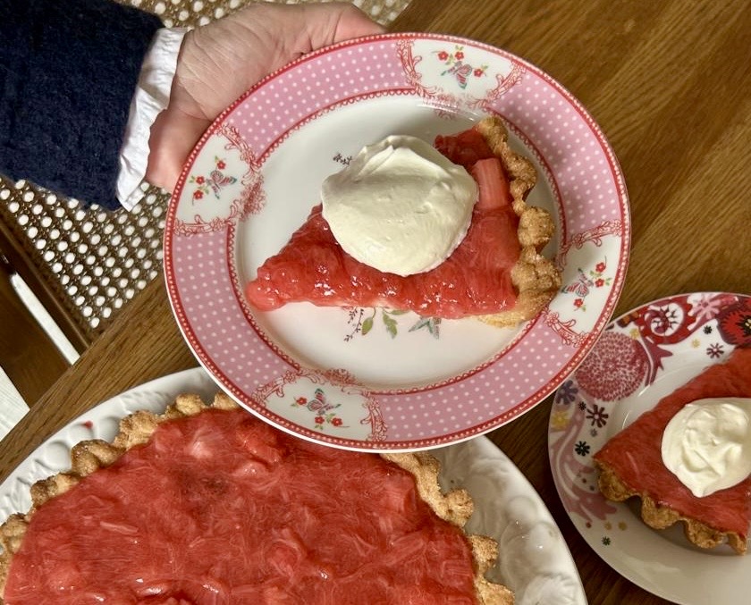 Ik verwerk rabarber in een harde wener taart gecombineerd met vanillepudding en aardbeien. De aardbeien komen uit de vriezer en zijn nog niet van de koude grond. Kijk hier voor het recept