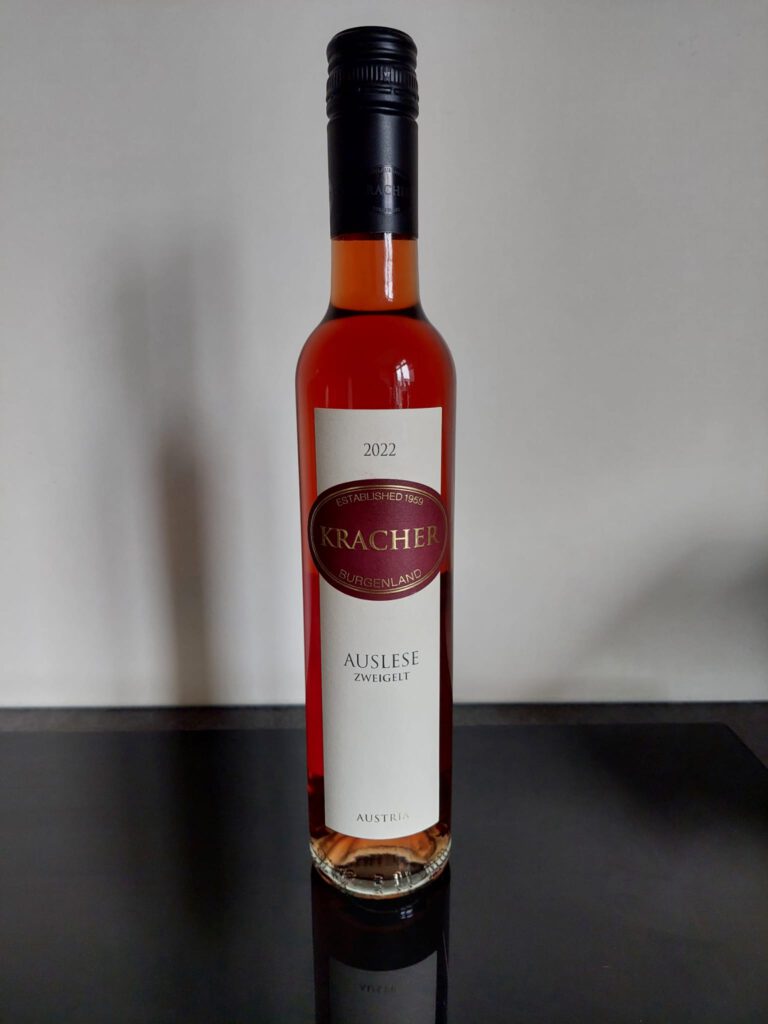 Bij dit gerecht past een zoete rode wijn. Ik heb gekozen voor een auslese gemaakt van zweigelt. Een druif uit Oostenrijk. Auslese betekent uitgekozen en later geoogst dan normaal waardoor de wijn zoeter is. De smaakintensiteit is vrij hoog, de wijn heeft een zacht mondgevoel en ook een klein zuurtje.
